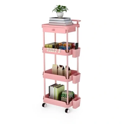Levede 4 Tier Beauty Trolley on Wheels with Drawer, Rolling Plastic Utility Cart for Home, Kitchen, Bathroom, Laundry & Office pink Storage Organizer