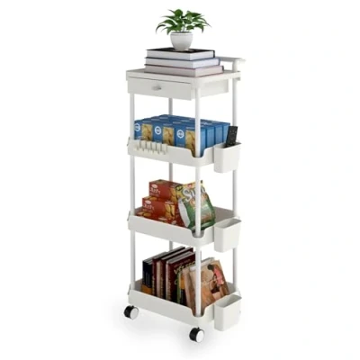 Levede 4 Tier Beauty Trolley on Wheels with Drawer, Rolling Plastic Utility Cart for Home, Kitchen, Bathroom, Laundry & Office White Storage Organizer