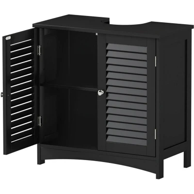 Description This Levede bathroom under sink cabinet offers a practical and space-saving storage solution for modern bathrooms. Finished in a sleek black colour, it fits neatly under most standard basins and helps keep your bathroom tidy and organised. The cabinet features a height-adjustable internal shelf, allowing flexible storage for toiletries, cleaning products and everyday essentials. Made from a combination of melamine-coated particle board and MDF, it provides reliable strength and durability for daily bathroom use. For added safety, this under basin cabinet is supplied with anti-tip wall fixing hardware, making it a suitable choice for busy family bathrooms. All required installation hardware and a neutral English instruction manual are included for easy assembly. Please Note: Color & Size: Please allow for a 1-3cm manual measurement variance and slight color differences due to monitor settings and lighting conditions. Key Features: Space saving storage: Compact under sink