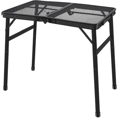 Description The Levede Folding Camping Table is a lightweight and durable solution for camping, picnics, BBQs and outdoor use. Constructed from strong aluminium alloy, this portable camping table weighs only 2.1kg, making it easy to carry, fold and store. Featuring a foldable design with two adjustable heights (27cm / 55.5cm), the table adapts easily to different outdoor needs. The metal mesh tabletop is heat-resistant, prevents water buildup and wipes clean with ease, ideal for outdoor cooking and dining. Finished in classic black, this compact outdoor folding camping table offers a stable structure and simple setup, perfect for camping trips, fishing, gardens and patios. Key Features: Portable design: Lightweight folding camping table that is easy to carry, store and transport Adjustable height: Two height options at 27cm and 55.5cm for versatile outdoor use Durable construction: Made from aluminium alloy for strength, stability and long-lasting use Metal mesh tabletop: