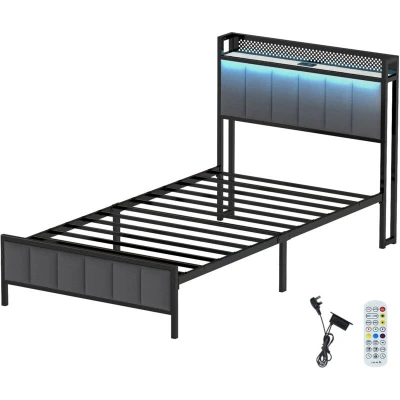 Description Bring contemporary style and smart design into your home with this Single size bed frame with LED lights, a perfect combination of comfort, durability, and modern technology. Crafted with a heavy-duty metal bed frame and upholstered headboard, this LED Single size bed creates an inviting atmosphere with adjustable RGB lighting. Control the light settings easily with the included remote or smartphone app, switching between colour presets, music sync mode, brightness levels, and timer options to set the mood for any occasion. The Single LED bed frame with USB and Type-C charging ports makes it easy to power your devices overnight without messy cables. The padded headboard offers a comfortable backrest for reading, gaming, or streaming, while the reinforced steel slats provide strong mattress support, removing the need for a box spring. With generous under-bed storage clearance, this upholstered LED Single bed frame with storage is ideal for keeping your room neat and