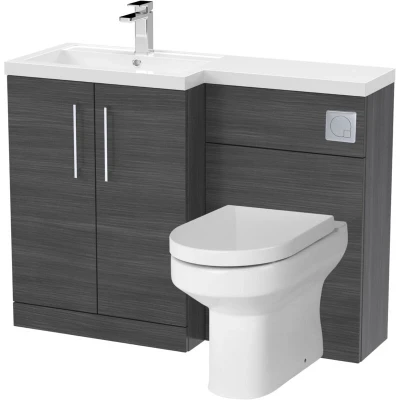 General description Dark, dramatic, and functional, the Level Bathroom Bundle Floor Standing Vanity Basin and WC Unit in Woodgrain Anthracite adds a bold finish to any bathroom. This left-hand unit combines a rich textured finish with practical features, making it perfect for premium modern interiors. Supplied with a full set of fixtures, including a soft-close seat and concealed cistern, this bundle offers all-in-one convenience for your bathroom needs. Technical specifications Vanity and WC Unit Dimensions: W: 1105mm x H: 858mm x D: 390mm Toilet Dimensions: W: 370mm x H: 410mm x D: 520mm Installation Designed for left-hand layout Includes all necessary fixtures for installation Usage Soft-close toilet seat for quiet and controlled closing Polymarble basin that resists stains and is easy to clean Ideal for ensuites, cloakrooms, or compact bathrooms Other information 5-year warranty