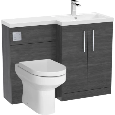 General description Dark, dramatic, and functional, the Level Bathroom Bundle Floor Standing Vanity Basin and WC Unit in Woodgrain Anthracite adds a bold finish to any bathroom. This right-hand unit combines a rich textured finish with practical features, making it perfect for premium modern interiors. Technical specifications Vanity and WC Unit Dimensions: W: 1105mm x H: 858mm x D: 390mm Toilet Dimensions: W: 370mm x H: 410mm x D: 520mm Installation Supplied with a full set of fixtures, including a soft-close seat and concealed cistern. Usage Soft Close: Fitted with a premium soft-close door mechanism for quiet and controlled closing, enhancing durability and reducing noise. Polymarble Basin: Smooth, non-porous surface resists stains and is easy to wipe clean, maintaining a pristine look with minimal effort. Space-Saving Design: Ideal for ensuites, cloakrooms, or compact bathrooms, maximizing available space without compromising style. All-In-One Convenience: Includes vanity unit, WC