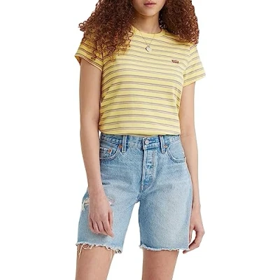 Levi's Women's The Perfect Tee Striped Chesthit Logo T Shirt, Cool Stripe Powdered Yellow, XS
