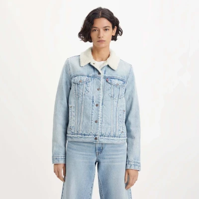 Womens Levis Original Sherpa Trucker Jacket in light blue.- Sherpa collar.- Front button placket with snap closures.- Long sleeves with snap buttons at the cuffs.- Spade chest pockets with snap-flap closures; side welt pockets.- Back waist tabs for adjustable fit.- Warm quilted lining in the sleeves.- Relaxed fit.- 100% Cotton.- Ref: 361360069
