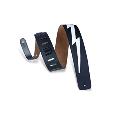 Levy’s 2 1/2″ wide black genuine leather guitar strap. Adjustable to 51″. Leather lightning bolt inlay and suede backing. Designed by Levy’s industry leading fashion designers.