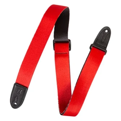 Levy's 1. 5" kids red guitar strap with black leather ends. Black plastic slide and loop adjusts from 28. 5" to 49". Strap will also work for adult guitar, ukulele, and mandolin. Handcrafted in Nova Scotia, Canada