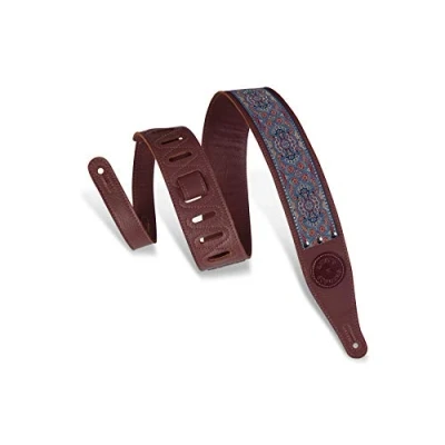 2 1/2” Arabesque - Indigo on Burgundy, Genuine Leather & Woven Fabric guitar strap Adjustable from 38” to 51” in length Intricately woven material premium, quality Leather sourced from the finest, accredited tanneries includes padding & genuine leather backing for superior comfort and support with reinforced stitching to prevent stretching