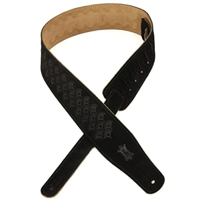 Textures Series Levy's 2 1/2" Wide black suede leather guitar strap Adjustable to 56" Two-ply strap with natural backing and single stitched edge. Dandelion emboss pattern Designed by Levy's industry leading fashion designers