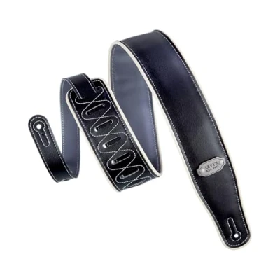 Rebel Series Levy's 2 3/4" Wide black vinyl guitar strap Adjustable to 56" Two-ply reversible vinyl guitar strap with cream piping and metal dog tag. Padded strap with reinforced Cream stitching Designed by Levy's industry leading fashion designers