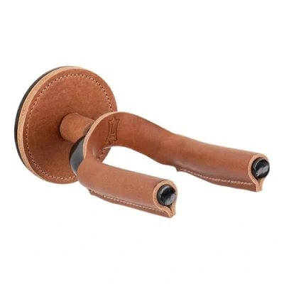 Forged Steel Guitar Hanger with Black Metal & Tan Veg-Tan Leather Yoke Wraps Wall Mounted Solid Steel Yoke with Stitched Leather Wrap Swivels to Accommodate Most Headstocks Includes One (1) Leather Wrapped Guitar Hanger Safe for Standard Polyurethane Finishes, Not Recommended for Vintage/Lacquer Finishes Leather Crafted & Assembled in Novia Scotia, Canada
