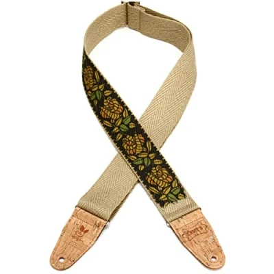 Levy?s 2 Inch Hemp ?Vegan? Guitar Strap With Printed Rosa Motif In Yellow ,Orange And Black On Natural Hemp Webbing With 2-Ply Cork Ends. Hemp strap features a 2.5" tall pocket on the inside for easy access storage. 2-ply natural cork ends support the weight of most guitars Silver metal slide and loop adjust from 37" to 62". International products have separate terms, are sold from abroad and may differ from local products, including fit, age ratings, and language of product, labeling or instructions.