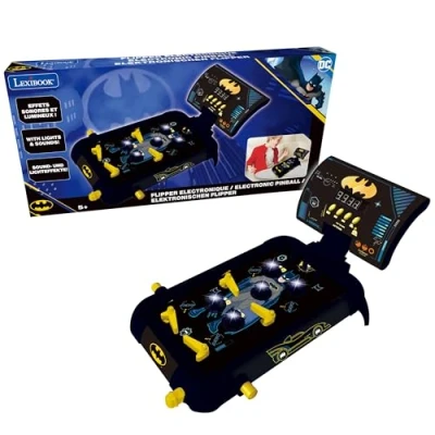 LEXIBOOK, Batman, Electronic table pinball, Fun Sounds and Light Effects, 5 Obstacles, Works with 3 LR14 Batteries, Black/Yellow, JG610BATLXB