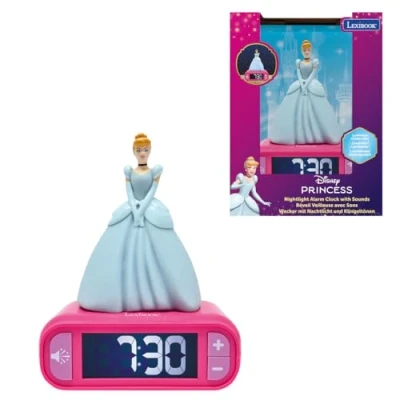 An alarm clock for kids, with a super cute design with the princess lighting up for a few minutes when your press on it. Sleep-friendly LCD backlit screen. Button to play magic sound effects. Alarm with adjustable volume and choice of magic-themed alarms. Alarm can be stopped with a simple press on the top of the clock or Disney Princess., Manufacturer: Lexibook