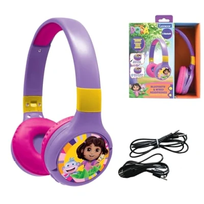LEXIBOOK, Dora the Explorer, 2 in 1 Bluetooth & Wired Headphones with Microphone and Control Button, Foldable Adjustable, Long lasting Rechargeable Battery, HPBT010DORLXB