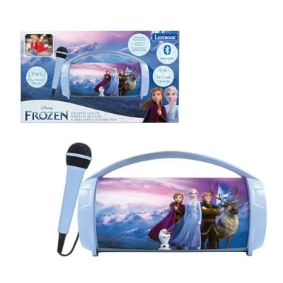 SEAMLESS WIRELESS CONNECTIVITY - Effortlessly pair your new wireless speaker with all you Bluetooth-enabled devices and take your music on the go. VERSATILE KARAOKE FUNCTIONALITY - Transform any gathering into a stage with the integrated karaoke feature, complete with a high-performance microphone for amplified vocals. ENHANCED AUDIO IMMERSION - Pair 2 speakers together to enjoy stereo sound along with Anna, Elsa and Olaf! EXPANDED AUDIO OPTIONS - Connect effortlessly via the 3.5mm auxiliary input jack, USB port, and SD card slot (supporting up to 32GB), providing extensive playback options for your favourite music. UNPARALLELED PORTABILITY AND ENDURANCE - Enjoy up to 3 hours of continuous playback, powered by the robust 1200mAh rechargeable battery, ensuring uninterrupted entertainment on the move., Manufacturer: Lexibook