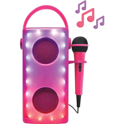 The Lexibook Luminous Wireless Speaker with Microphone is a pink, portable speaker featuring powerful audio, multi-colored lighting, and a built-in microphone for karaoke. It offers Bluetooth, SD/TF, USB, and Aux connectivity, along with a rechargeable battery and convenient handle for easy transport.