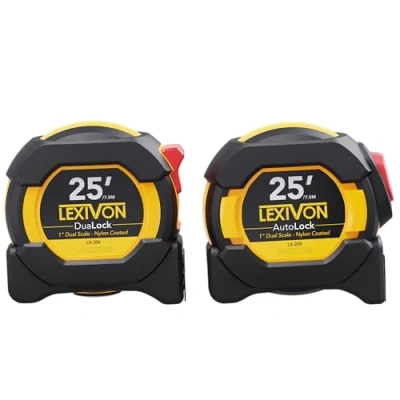 LEXIVON [2 Pack] 25Ft/7.5m Tape Measure, DuaLock & AutoLock 1 Inch Wide Blade with Nylon Coating, Matt Finish White Yellow Dual Sided Rule Print Ft/Inch/Fractions/Metric (LX 204)