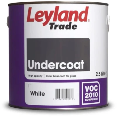 General description The Leyland Trade Undercoat Paint in White is an ideal base coat for achieving a smooth and durable finish with gloss topcoats. This alkyd-based undercoat is suitable for both interior and exterior applications, providing excellent hiding power and a dense covering. Technical specifications Color: White Volume: 2.5L Coverage: 17 square metres per litre Type: Solvent-based Base: Alkyd