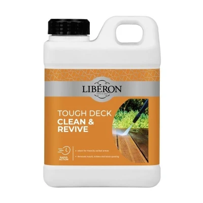 General description Tough Deck Clean and Revive is an effective cleaner for old and dirty natural exterior wooden decking that has dulled and faded over time. It is ideal for heavily soiled areas and prepares decking for finishing by removing black spotting caused by mould or lichen from most types of wood, while also helping to prevent the re-growth of fungi. Technical specifications Coverage: 30 m² Drying time: 24 hours Usage Application method: Scrubbing brush or broom Tool cleaning: Water