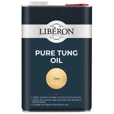 General description Liberon Pure Tung Oil is a premium, pure, and natural oil designed for woodcare. It provides a hard-wearing matt finish, making it ideal for surfaces such as kitchen worktops, tables, and all high-quality interior wood. This oil is suitable for both interior and exterior use and is highly resistant to water, alcohol, and food acids. It contains no added dryers, ensuring it is safe for use on toys and objects that may come into occasional contact with food. Technical specifications Coverage: 8-12m² per litre Dry Time: 24 hours between coats, 4 days final Application: Brush or Cloth Tool Cleaning: White Spirit Other information Recommended for use on external oak Being a penetrating oil, it allows the wood to age gracefully and develop a natural patina