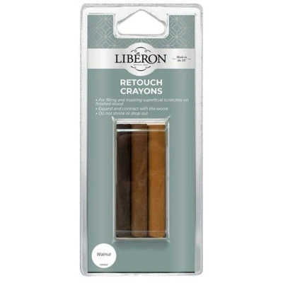 General description This set includes three Liberon Retouch Crayons in Walnut, designed for repairing superficial scratches and imperfections on finished wooden surfaces and furniture. They are suitable for interior use and help restore the appearance of wood by filling in scratches, nail holes, and worm holes. Technical specifications Number of crayons: 3 Color: Walnut Compatibility and accessories Compatible with various finished wooden surfaces and furniture Can be used alongside other wood repair products for better results Installation Simply rub the crayon over the scratch or hole to fill it in Buff off any excess for a smooth finish Usage Apply the crayon directly onto the scratch or imperfection Use a gentle rubbing motion to fill the area Buff lightly to blend with the surrounding wood surface