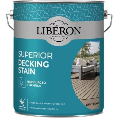 General description The Liberon Superior Decking Stain in Light Silver (5 litres) is a high-performance, versatile product designed to keep your decking looking great while providing reinforced protection and an outstanding finish. Its biosourced formula, made from vegetable oils and modified bio-based resins, minimizes environmental impact. This stain is water and UV resistant, featuring an anti-slip finish to enhance safety on wet surfaces. Technical specifications Volume: 5 litres Temperature range for application: -10°C to +35°C Drying time: 2 hours before applying a second coat Cure time: At least 24 hours before use Water-based product Preparation Ensure the surface is clean, dry, and free from previous finishes and dust. Lightly sand new wood and clean old wood. For hardwoods, expose for up to 12 months before application to open grain and improve adhesion. Application Test on an inconspicuous area, especially for exotic hardwoods. Ideal conditions: Apply in dry weather,