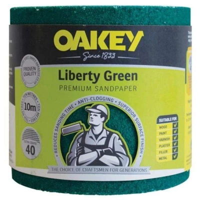 General description Oakey Liberty Green Sanding Roll is the professional decorator’s first choice for sanding. It works faster, lasts longer, and resists clogging, delivering everything a true tradesperson requires. This sanding roll is perfect for everyday decorating as well as heavy-duty applications. Technical specifications Grit: 40 (coarse) Roll size: 115 mm wide x 10 m long Material: Premium grade aluminium oxide with heavy E-weight backing Compatibility and accessories Suitable for hand and machine sanding Can be used on wood, metal, plaster, filler, varnish, and paint Other information