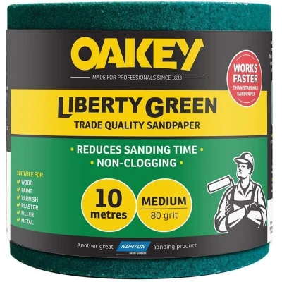 General description Oakey Liberty Green Sanding Roll is the professional decorator’s first choice for sanding tasks. It is designed for both everyday decorating and heavy-duty applications, offering faster material removal, a longer lifespan, and anti-clogging properties. This sandpaper is constructed from premium grade aluminium oxide with a heavy E-weight backing, making it self-sharpening and extremely durable, lasting up to 10 times longer than standard sandpaper. Technical specifications Grit: 80 Roll size: 115 mm wide x 10 m long Compatibility and accessories Compatible with standard sanding tools and machines Can be used with sanding blocks, orbital sanders, and other power tools Installation Cut the sanding roll to the desired length if necessary Attach to sanding blocks or fit onto compatible power sanders Usage Use for smoothing surfaces, removing paint or varnish, and preparing surfaces for finishing Apply moderate pressure and move evenly across the surface for best