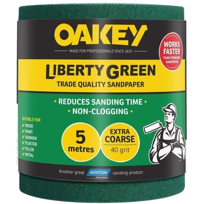 General description Oakey Liberty Green Sanding Roll is designed for professional decorating and heavy-duty sanding tasks. It offers faster material removal, a longer lifespan, and clog resistance. This sanding roll is suitable for various surfaces including wood, metal, plaster, filler, varnish, and paint. It can be used by hand or with machines, making it versatile for different applications. Technical specifications Size: 115mm width x 5m length Grit: 40 (Extra Coarse) Material: Premium grade aluminium oxide Backing: Heavy E-weight Durability: Lasts up to 10 times longer than standard sandpaper Compatibility and accessories Compatible with hand sanding and power tools Suitable for use on wood, metal, plaster, filler, varnish, and paint Installation Wrap the sanding roll around a compatible sanding block or insert into a sanding machine as per device instructions Usage Use for surface preparation, smoothing, and finishing tasks Apply moderate pressure for effective sanding