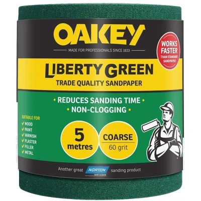General description Oakey Liberty Green Sanding Roll is designed for professional decorating and heavy-duty applications. It provides fast sanding, long-lasting performance, and resists clogging. This sanding roll is suitable for both hand and machine sanding, making it versatile for various surfaces including wood, metal, plaster, filler, varnish, and paint. Technical specifications Size: 115mm x 5m Grit: 60 Type: Sanding roll Material: Aluminium oxide with heavy E-weight backing Durability: Lasts up to 10 times longer than standard sandpaper Compatibility and accessories Compatible with hand sanding and power sanders Suitable for use on wood, metal, plaster, filler, varnish, and paint Installation Wrap the sanding roll around a compatible sanding block or insert into a power sander Ensure the roll is securely attached before use Usage Use for smoothing surfaces during decorating or renovation projects Ideal for removing paint, varnish, or preparing surfaces for finishing Suitable