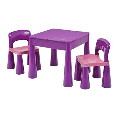 FEATURES: This multi-purpose kids activity table and chair set comes with a reversible and dual-purpose tabletop, one side is smooth for writing, eating, playing, and doing homework. Flip the tabletop over for a construction top surface – ideal for building block play and perfect for little ones who love to build (suitable for all leading brands of building blocks) VALUE: In addition, the base of the table is deep enough to store small toys, books, and games, including building blocks – and so is great for keeping your play area clutter free. The base is also perfect for sand and water play. Let your child's imagination go wild as they build sandcastles or splash around in the water. The table comes equipped with a plug, so it is easy to clean and drain. Ideal for indoors and outdoors – simply wipes clean DEVELOPMENT: This unique 5 in 1 kids table and chair set provides lots of benefits for your child – develops fine and gross motor skills as well as enhancing creativity, imagination, and social skills STURDY AND SAFE: This activity table and chair is made from non-toxic plastics and has been safety tested for stability and durability. Rounded corners and edges for comfort. Practical and stylish trumpet style legs make this set even more sturdy. Complies with European and British toy safety standards (EN71) for safety and strength DIMENSIONS AND ASSEMBLY: H465 x W510 x D530mm, Chairs: H460 x W300 x D310mm, Chair Seat Height 260mm. Supplied flat packed for simple assembly – no tools required