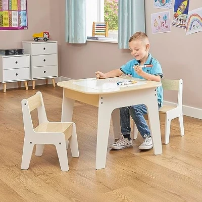 FEATURES: Ideal for ages 2 years and older. This Kids 3 in 1 Storage Table and Chair Set is perfect for keeping your kid’s playroom organized. With a double-sided tabletop, it easily flips over to give them space to draw, paint, and play. The set is perfect for arts and crafts, as well as other activities. With its sturdy construction, it can hold up to your child’s playtime. VALUE: This smartly crafted table features a whiteboard (for water-based pen) on one side that flips over to reveal a chalkboard surface on the reverse. FUNCTIONALITY: The table has built in storage underneath the tabletop which is space saving and ideal for storing books, small toys, games, pens, and pencils etc. As well as writing or drawing with water-based pens or chalk the tabletop can also be used for dining, reading, and playing. STURDY AND SAFE: Made from durable, long-lasting wood materials and safety tested for strength and stability. Complies with European and British toy safety standards (EN71) for safety and strength. DIMENSIONS: Table dimensions: H500 x W600 x D600mm, Chair: H450 x W310 x D290mm, Seat Height 260mm. Comes flat packed and includes easy-to-read instructions for quick and easy assembly.