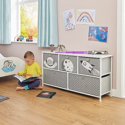 FEATURES: Ideal for 2 years and older. Introducing our unique designed kids storage chest featuring fun and engaging characters. This adorable storage unit is supplied with 5 removeable drawers which are great for organising toys, clothes and other bedroom or playroom accessories. VALUE: The removeable drawers offer generous storage capacity. A firm extra board base is supplied for the bottom of each drawer – providing extra strength and stability. Drawers simply slide into place and each shelf has a back stop to prevent drawers sliding out. FUNCTIONALITY: Our storage units come with plastic feet to protect floors from scratching. Feet are height adjustable and so uneven floors are not an issue. STURDY AND SAFE: Drawers are manufactured from breathable non-woven and soft fabric whilst the white wooden top is made from hard wearing MDF. Our patented frame is manufactured from sturdy white steel. Comes with wall fixtures so you can safely secure the unit to the wall. Complies with European and British toy safety standards (EN71) for safety and strength. DIMENSIONS: H550 x W1000 x D300mm, Small Drawers: H215 x W300 x D290mm, Large Drawers: H215 x W450 x D290mm. Supplied flat packed complete with assembly instructions.