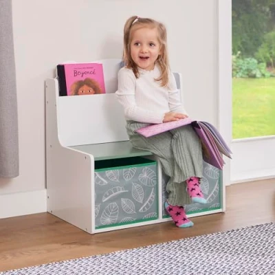DESCRIPTION: Suitable for ages 3 years and over, our cute Teddy Bear bookcase is designed for optimum function in a small space. Combining seating, a bookshelf and two fabric storage boxes this one compact unit provides a practical and useful space for storage of books, toys, soft toys and any other bedroom or playroom clutter. FEATURES: The deep bookcase compartment with rounded edges allows for storage of various size books and you can create a mini child’s library space in your own home. The fabric storage boxes have a lovely leaf motif to add a calming and nature inspired look to your room aesthetic. SAFE AND STURDY: Furniture is designed with rounded edges for safety and made with sturdy long lasting wood construction. Safety tested to meet relevant standards. DIMENSIONS: Overall dimensions: H60 x W61.5 x D 50cm | Seat height: 28cm | Item comes flat packed with simple self-assembly.