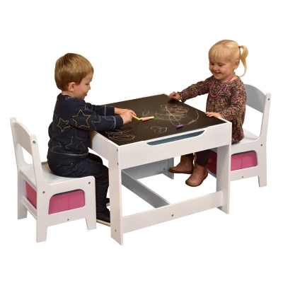 TABLE AND CHAIRS Liberty House Toys white table and chair set includes slide out pink woven fabric storage boxes within the chairs for quick and easy storage EASY-TO-ASSEMBLE KIDS FURNITURE SET Liberty House Toys White Table & 2 Chairs set with pink bins is easy assembling Perfect piece of furniture for children ages 3+ Supplied flat packed STORAGE Hide away play things while the children sit and play in their pink storage bins and the table has a deep bottom perfect for small toys and pencils! GIFT FOR AGES 3+ Give the gift of play with this white table and chairs set with pink storage bins DIMENSIONS: Table - 48 x 60 x 60cm, Chairs - 30 x 28.5 x 52.5 cm,Seat Height 26cm SPECIAL FEATURE reversible top with chalkboard for hours of play! DEVELOPMENT AND QUALITY Liberty House Toys is a leading supplier of fine children's furniture traditional toys playroom furniture and nursery products Furniture finish: white lacquer