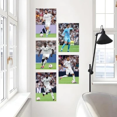 Officially licensed product of Real Madrid CF. Certification included. A % of this sale goes back to your club. Football poster set (sold as set of 5) that feature Real Madrid CF superstars Courtois, Carvajal, Militao, Rudiger & Mendy Great wall decoration Great football gift Sold as a set of 5. Picture frame not included Available in 3 different set sizes Printed using UV inks on high quality vinyl for long lasting vibrant colurs FRAME NOT INCLUDED
