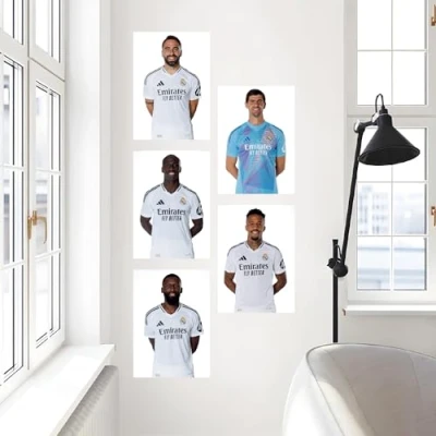 Officially licensed product of Real Madrid CF. Certification included. A % of this sale goes back to your club. Real Madrid Vinyl Wall Mural (sold as set of 5) that feature Real Madrid CF superstars Courtois, Carvajal, Militao, Rudiger & Mendy Great wall decoration Great football gift Sold as a set of 5.Available in 3 different set sizes Printed using UV inks on high quality vinyl for long lasting vibrant colours FRAME NOT INCLUDED