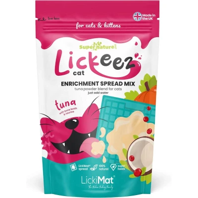 LickiMat Lickeez Cat Tuna Enrichment Spread Mix for Cats 100g is a 100% natural, nutrient-rich powder made from line-caught tuna and superfoods. Simply mix with water to create a spread, gravy, or topper for healthy feline enrichment and wellbeing.