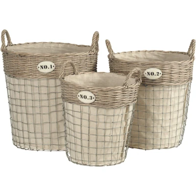 General description The charming set of three laundry baskets provides an elegant way to keep your dirty clothing, linen, and towels off the floor for a tidier room. Each basket is made from a combination of weaved willow and metal wire, featuring a natural linen bag that is durable and sturdy for all your laundry needs. With the three baskets, you can designate them to different rooms for a clutter-free home. Moreover, handles on the baskets make it easier to carry when required. Each basket features its own tag with either 'No. 1', 'No. 2', or 'No. 3' for added style and rustic charm. A significant way to keep your home organized and tidy, this set will add style and practicality to any room. Technical specifications Set of 3 baskets Materials: Weaved willow, metal wire, natural linen Usage Ideal for storing dirty clothing, linen, and towels Can be designated for different rooms Easy to carry with handles