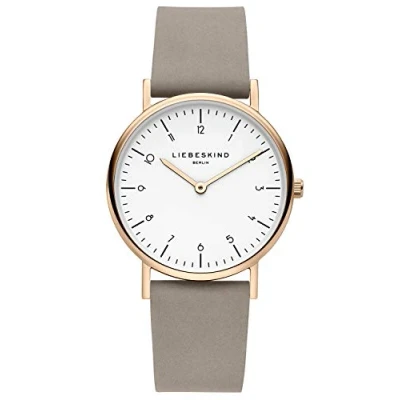 Two-hand women's watch with stainless steel case and high-quality grey leather strap, comfortable to wear, the watch stands out due to its special indexes, which are supported by a rose gold case Polished stainless steel case, diameter 34 mm, scratch-resistant mineral glass, water resistance tested up to 5 bar/ATM High-quality leather strap with pin buckle. The easy-change system with interchangeable spring bars ensures easy changing of the strap Easy-to-read dial Packaged in an original Liebeskind Berlin gift box
