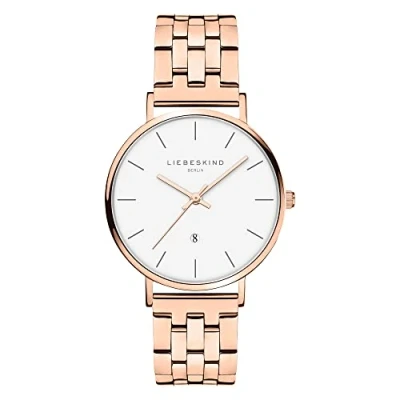 Women's watch from Liebeskind Berlin with stainless steel case and high-quality stainless steel strap. It not only promises the best wearing comfort, but also gives you a unique feeling in any outfit Stainless steel case IP rose gold polished, diameter 34 mm; scratch-resistant mineral glass, water resistance tested up to 3 bar/ATM High-quality rose coloured link bracelet made of stainless steel with folding clasp. The easy-change system with interchangeable spring bars ensures easy changing of the strap Easy-to-read dial with date display Packaged in an original Liebeskind Berlin gift box