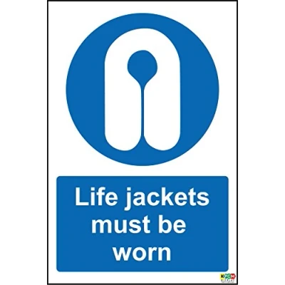 Life jackets must be worn sign Self adhesive vinyl 300mm x 200mm Digitally printed and laminated for extra durability Remove backing film and apply to dry, smooth, oil free surface.