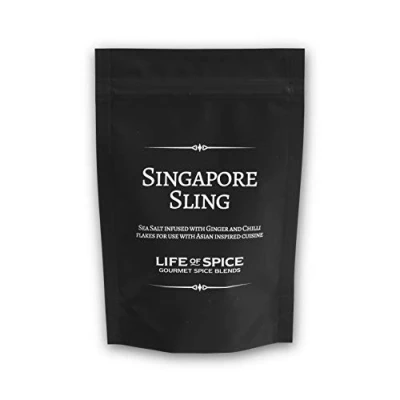 Sea salt infused with ginger and chilli flakes for use with asian inspired cuisine Try marinading strips of beef in Singapore Sling and Soy Sauce before stir-frying Stir fry sliced vegetables with soy sauce and garlic, and finish with a dash of Singapore Sling to add a crunch Perfect with Beef, Chicken, Pork or Vegetables, contains Sea Salt, Ginger, Garlic and Chilli Flakes Store in a cool dry place