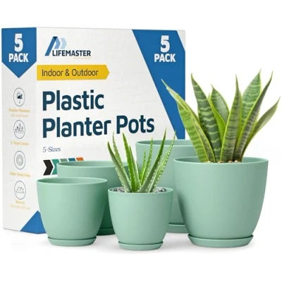 UNIQUE DRAINAGE DESIGN: Lifemaster Planter Pots feature strategically placed drainage holes that prevent blockages and soil leakage, ensuring your plants have the optimal environment for healthy growth. The holes at the bottom promote excellent water drainage and aeration, keeping your plants' roots healthy and thriving. MOST VALUABLE AND FUNCTIONAL: This set includes 5 different sizes of plastic planters (7”, 6.6”, 6”, 5.3”, 4.8” inches), making it perfect for growing a variety of plants both indoors and outdoors. Whether you're cultivating orchids, snake plants, mint, herbs, cacti, or aloe, these planters provide the versatility you need for your gardening projects. LIGHTWEIGHT AND DURABLE: Made of high-quality, sturdy plastic, these planters are lightweight yet incredibly durable. They are designed to withstand the elements and daily wear and tear, making them ideal for both indoor and outdoor use. You can safely place them on your windowsill or repot your plants without worrying about the pots deforming or breaking. MODERN DESIGN: The mint color finish and streamlined design of Lifemaster Planter Pots bring a modern, minimalistic aesthetic to any home or office decor. The elegant appearance of these planters enhances the visual appeal of your space, seamlessly blending with any style of interior or exterior design. SPACE-SAVING STACKABLE DESIGN: The stackable feature of these planters allows you to save space when they are not in use. Their nesting capability ensures that they take up minimal storage space, keeping your gardening area neat and organized. This practical design is perfect for gardeners who value both functionality and efficiency.