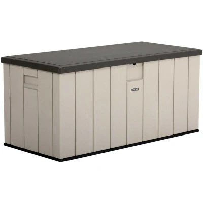 General description Need a more convenient place to store items around your yard? Lifetime’s Outdoor Storage Deck Box (150 Gallon) is the perfect solution to expand your storage and improve access to items you use regularly. Whether it's gardening tools, lawn equipment, yard games, or outdoor seat cushions, this deck box makes it easy to store and find your belongings when needed. It is designed to be durable, UV-protected, and weather-resistant, ensuring your items receive years of protection. The lid is lockable (lock not included) for added security and features a controlled spring-hinge for easy opening and closing. With molded side handles, it is easy to transport, and its sturdy design allows it to double as a bench. Technical specifications Interior capacity: 150 gallons Construction: Rigid Dual-Wall High-Density Polyethylene (HDPE) Color: Black bottom, desert sand sides, brown lid Warranty: 10-year limited warranty Other information Easy straight-forward assembly