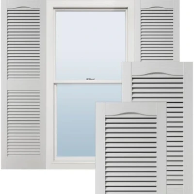 Item Description: 14 1/2"W x 43"H Lifetime Vinyl, Standard Cathedral Top Center Mullion, Open Louver Shutters, w/Installation Shutter-Lok's & Matching Screws (Per Pair), White Dimensions: 14-1/2 in. Width x 1 in. Depth x 43 in. Height Includes pair of shutters and color-matching hardware Easiest installation - installs in minutes with included hardware Due to materials, widths and lengths are nominal +/- 1/2" Durable construction features -through color and crisp woodgrain texture, Weight: 5.09 Pounds, Manufacturer: Ekena Millwork