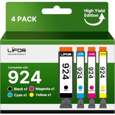 Model: HenceBuy 924 ink cartridges combo pack compatible with HP 924 ink (No Chip, Not Original) Compatible Printer: 924 ink cartridges 4 pack Compatible with HP OfficeJet Pro 8120e OfficeJet Pro 8122e 8124e 8125e 8132e 8134e 8135e 8130e 8138e 8139e All-in-One Printer Package Contents: 924 ink cartridges multipack , including 1x 924 black ink cartridges , 1x 924 cyan ink , 1x 924 yellow ink , 1x 924 magenta ink and 1x CHIP REMOVE TOOL (924 ink cartridge has no chip, please use the tool to get the OEM chip and install it into the new cartridge) High Page Yield: 700 pages per 924 Black Ink Cartridge and Colour Ink Cartridge (At 5% coverage of A4 paper) Get a better outcome at a lower cost: LIFOR is dedicated to providing a lower printing cost & helps reduce carbon footprint than using original cartridges without compromising on print quality. Available customer service and tech support, any questions can be contacted by the "Contact Seller" option on your order information page. Please note that the packaging may slightly vary