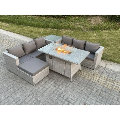 General description This Fimous Light Grey Corner Rattan Fire Pit Garden Furniture Set includes a gas heater burner, lounge sofa, side coffee table, and a big footstool. It features a stylish light grey mixed rattan design complemented by dark grey fabric cushions, providing both comfort and elegance for your outdoor space. Technical specifications Set Dimensions: 2 x Three Seater Sofa: 177W x 65D x 66H cm 1 x Fire Pit Table: 140L x 80W x 69H cm 1 x Side Table: 65L x 65W x 66H cm 1 x Footstool: 65L x 65W x 34H cm Material: Light grey mixed rattan with dark grey fabric 5mm thickness transparent tempered glass with suckers on the surface to prevent sliding 8 cm thick seat cushion with soft pillow back cushion Installation The furniture set comes flat packed and is easy to assemble. Ensure to follow the assembly instructions carefully for optimal setup. Usage For safety, please place the gas fire pit on the glass top and not under it. Avoid covering the igniter with lava rocks. It is