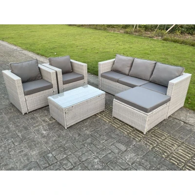 General description This deluxe rattan sofa set is a great addition to your patio or garden. It is made of high-quality PE rattan and features a durable galvanized steel construction, ensuring sturdiness and longevity. This furniture set can be left outdoors all year round. Technical specifications 1 x Sofa with double armrest: 177W x 65D x 66H cm 2 x Armchairs: 74L x 65W x 66H cm 1 x Oblong coffee table: 85L x 50W x 37H cm 1 x Big footstool: 65L x 65W x 34H cm Material: PE rattan with galvanized steel frame Seat cushion thickness: 8 cm Glass tabletop: 5 mm thickness clear tempered glass Installation Items come flat-packed and require self-assembly. Sturdy galvanized steel tube metal frames are coated to prevent rust. Usage This furniture set is low maintenance, featuring removable cushion covers for easy cleaning. It is recommended to keep the cushions indoors or use a rain cover when not in use. Additionally, cover the furniture if it will not be used for an extended period. Other